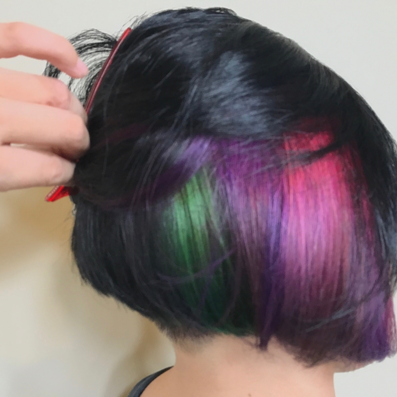 | Stylist's thoughts on the outcome | It is good to see my customers wanting to be a change of image. This customer requested to have the left side of her head to be shaven therefore, the inner color is on her right. This will give a edgy and chic look to those customers who are seeking for a stronger image however, still wants to keep that feminine feel. I recommend this hair style to customers who does not want to have the whole head colored but still want to have brightly colored hair to be seen at some times. |